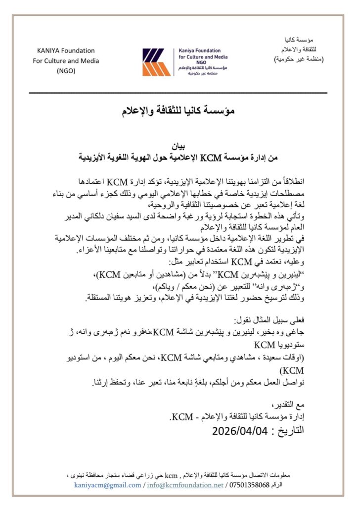 انطلاقاً من التزامنا بهويتنا الإعلامية الإيزيدية، تؤكد إدارة KCM اعتمادها مصطلحات إيزيدية خاصة في خطابها الإعلامي اليومي وذلك كجزء أساسي من بناء لغة إعلامية تعبر عن خصوصيتنا الثقافية والروحية،